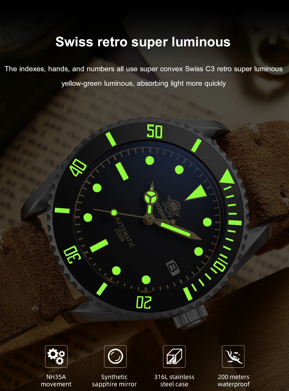 ADDIESDIVE Men’s Watch Automatic NH35 Movement C3 Luminous 316L Stainless Steel Case Date Display Waterproof 200m Diving Gift Wa