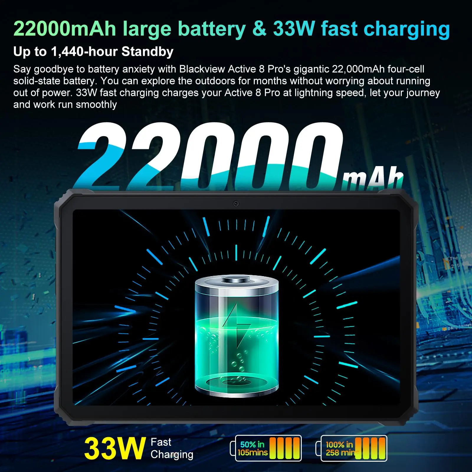 Say goodbye to battery anxiety with Blackview Active 8 Pro’s gigantic 22,000mAh four-cell solid-state battery. With up to 1,440hours of standby time, you can explore the outdoors for months without worrying about running out of juice. Keep your journey and work going strong with uninterrupted productivity and entertainment.