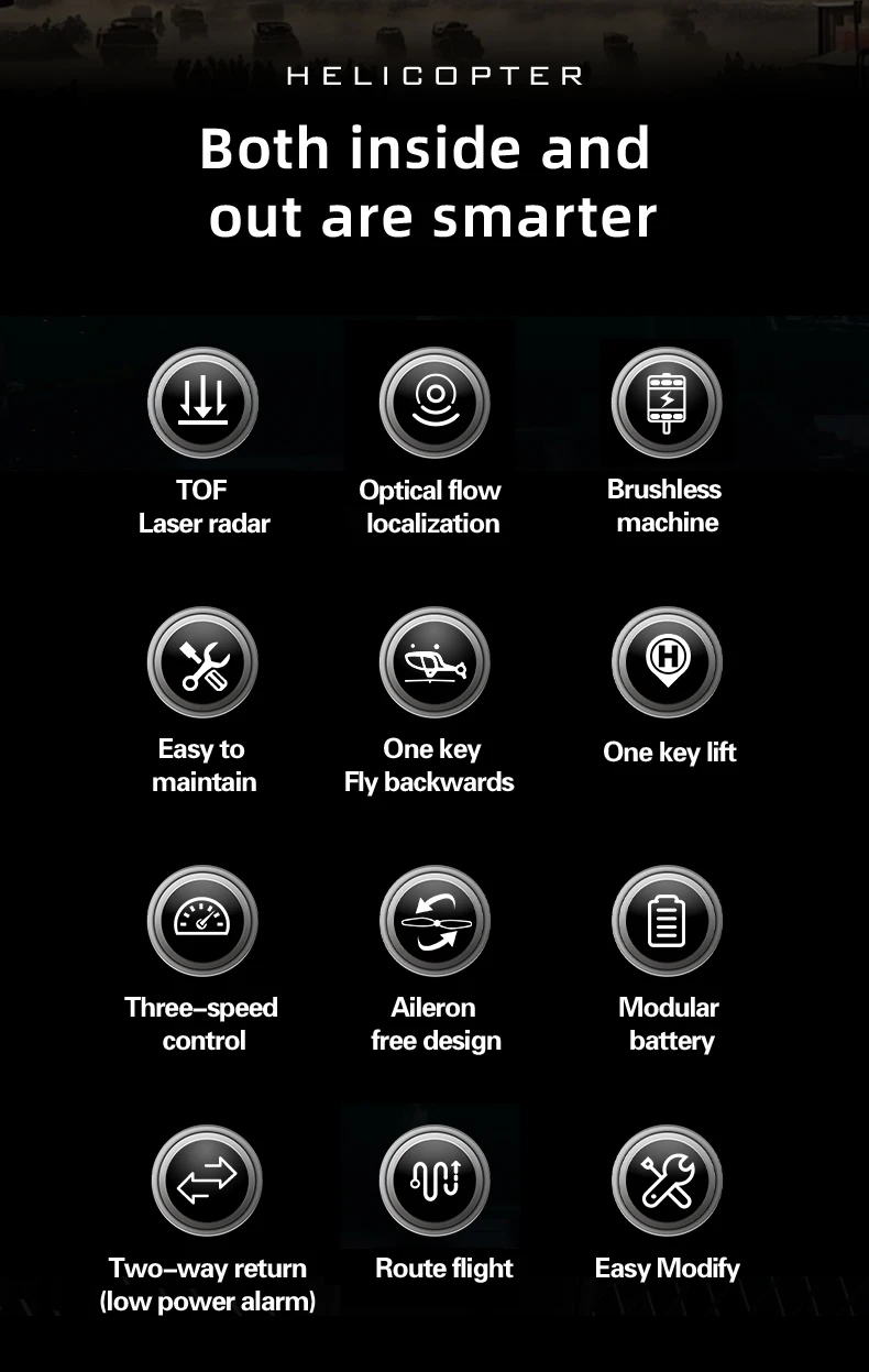 1. Adopting a single blade design without ailerons, a 6-axis electronic gyroscope for stability enhancement, and incorporating a pressure gauge for altitude determination, optical flow positioning, and TOF LiDAR for altitude determination, making flight more stable and easier to control