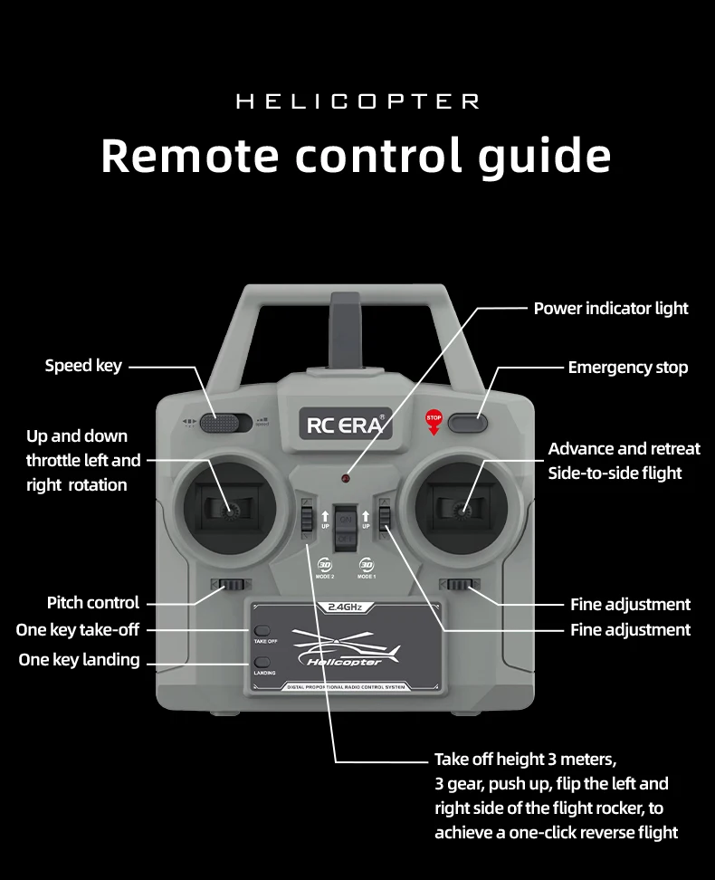 8.Functions including low voltage alarm, locked rotor protection, loss of control protection, large and small rudder conversion, one key takeoff, one key landing, etc.