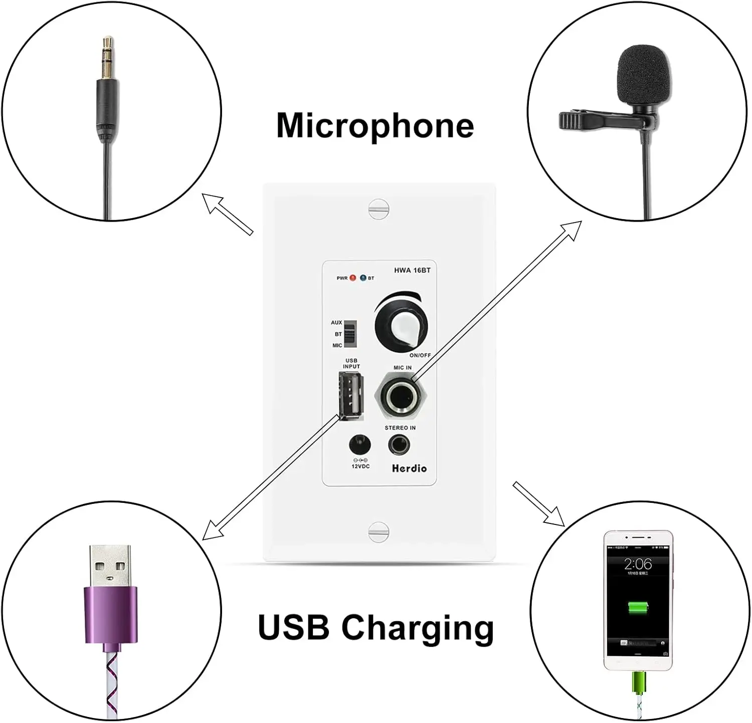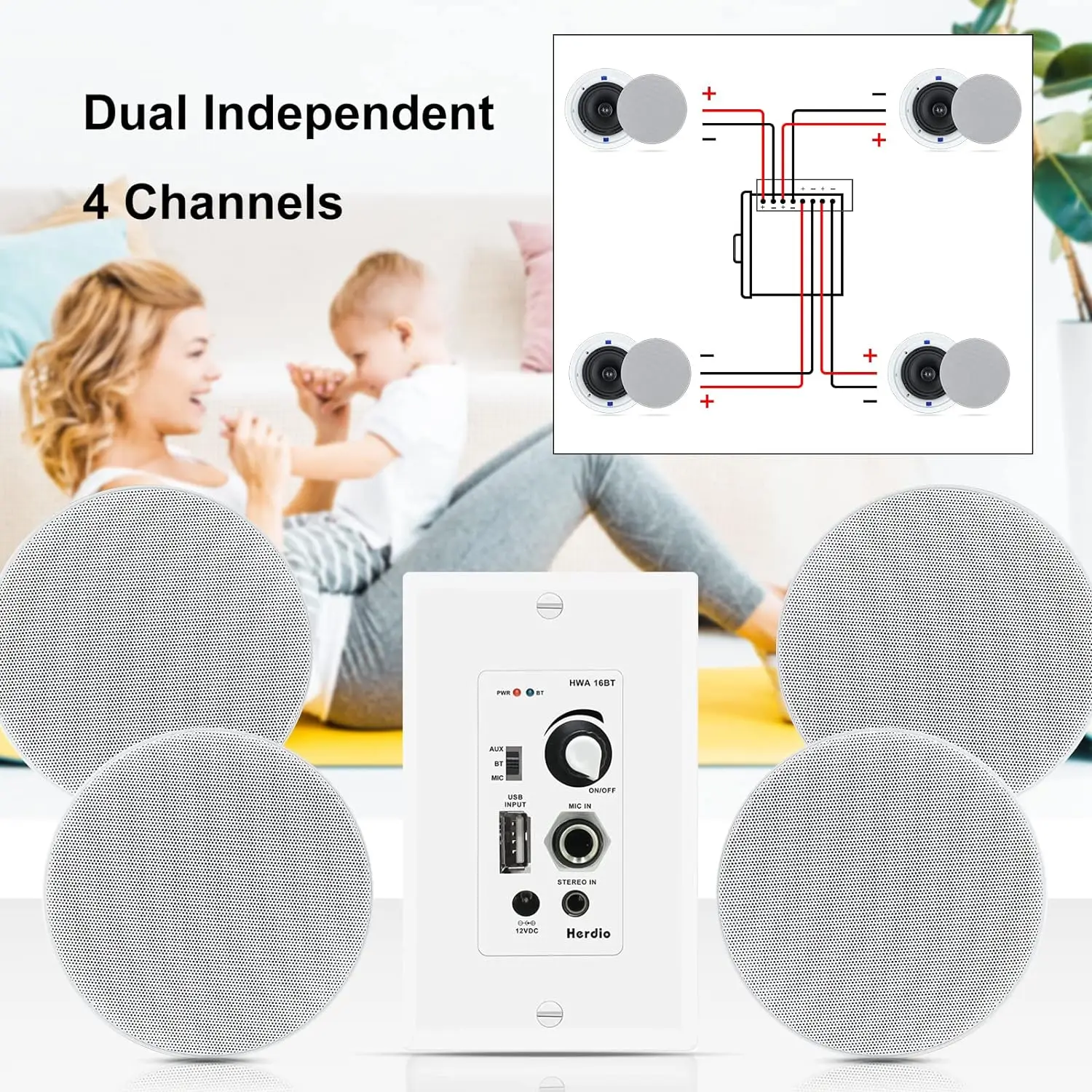 Herdio Bluetooth Wall Amplifier 4 Channels Volume Control Wall Plate USB/MIC/AUX(3.5mm) Inputs Connect 4 Speakers with 12V 3A Power Supply,HWA-16BT-4CH