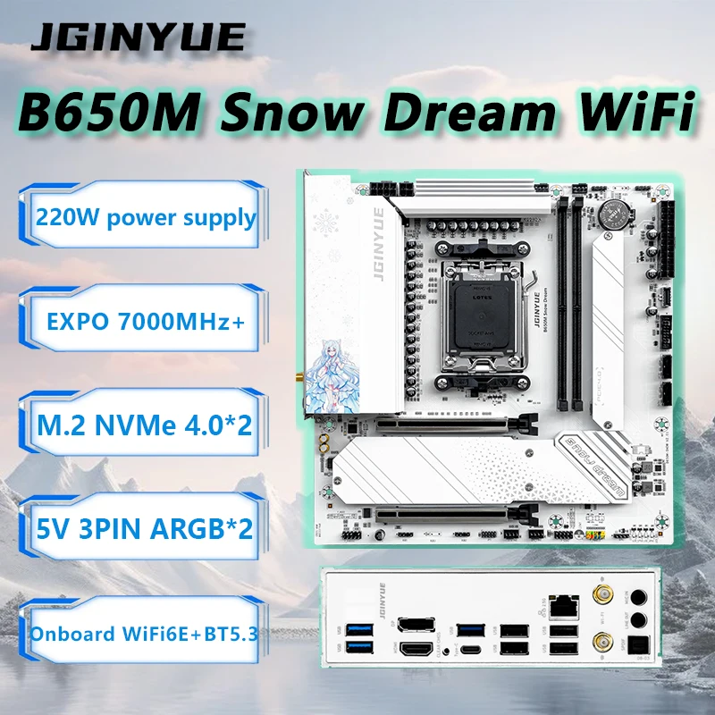 JGINYUE B650M Snow Dream WiFi Motherboard M-ATX For Ryzen7000/8000/9000series MAX 9800X3D/9950X3D DDR5 RAM PCIe4.0x16*2 M.2*3