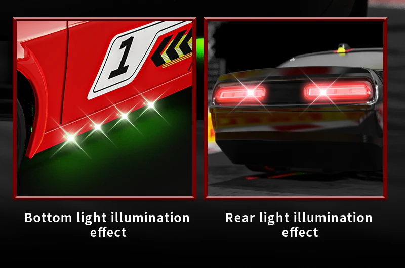 2. Our KF27 has more lights. They are more dazzling. The headlights and the tail wing lights as well as the two rows of lights under the car body are more advanced. Most of the similar products on the market only have the headlights.