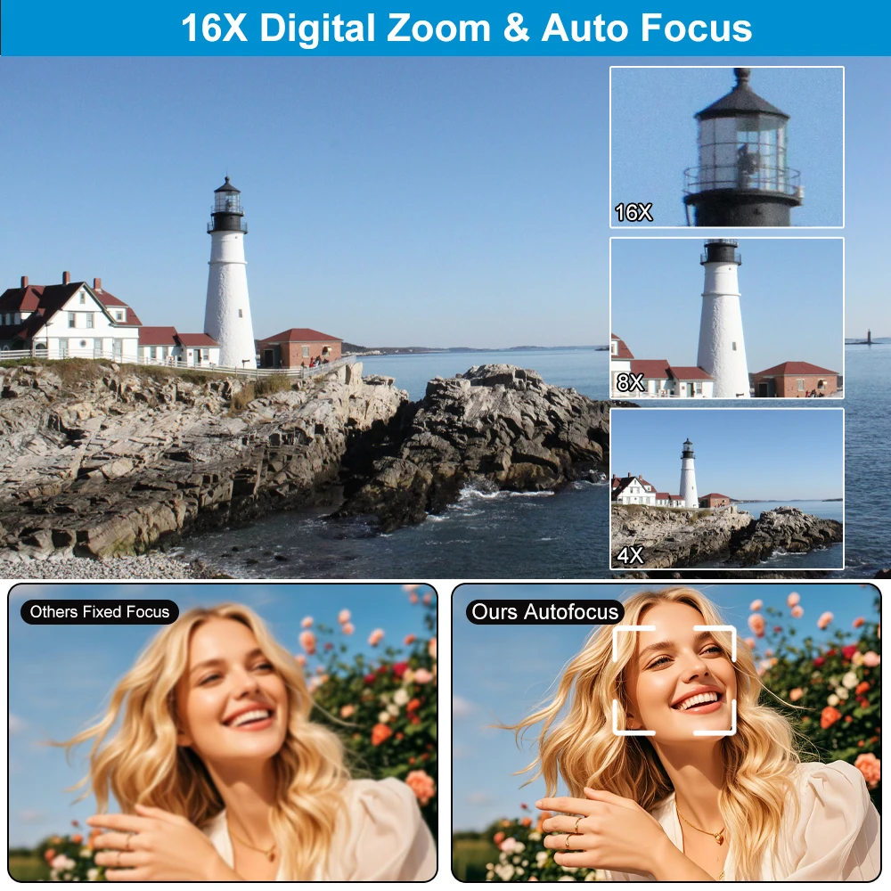 1.Entry-Level Friendly Design: Equipped with a 2.8-inch HD LCD screen and an ergonomic non-slip grip, this digital camera makes it easy for children, seniors, and students to operate. With fast autofocus and 16x digital zoom, capture clear close-ups from as near as 10cm and distant scenic or sports scenes effortlessly.