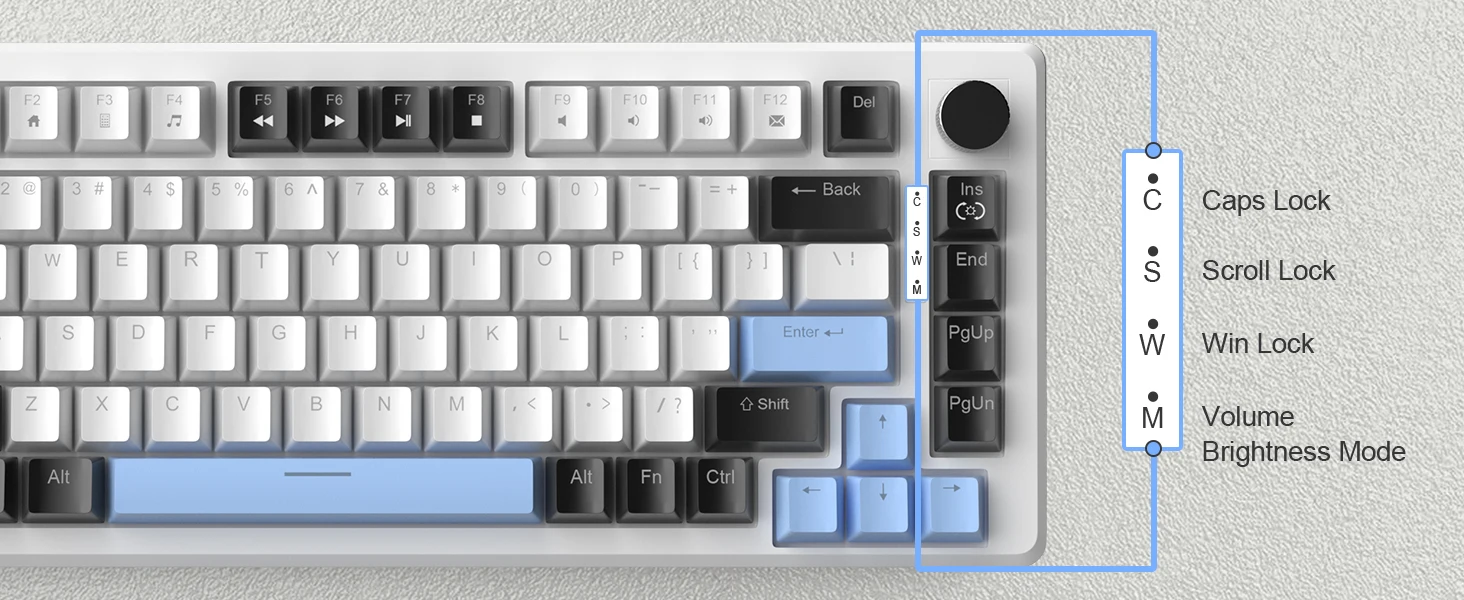 2-IN-1 MULTIFUNCTIONAL KNOB: The knob controls the audio / backlight, long press to switch between them. When the keyboard is in audio mode ( by default ), the indicator M is not lit, turn left and right to adjust the volume, press the knob to pause or play. When the keyboard is in backlight mode, indicator M lights up, turn left and right to adjust the light brightness, press it to switch light effects.