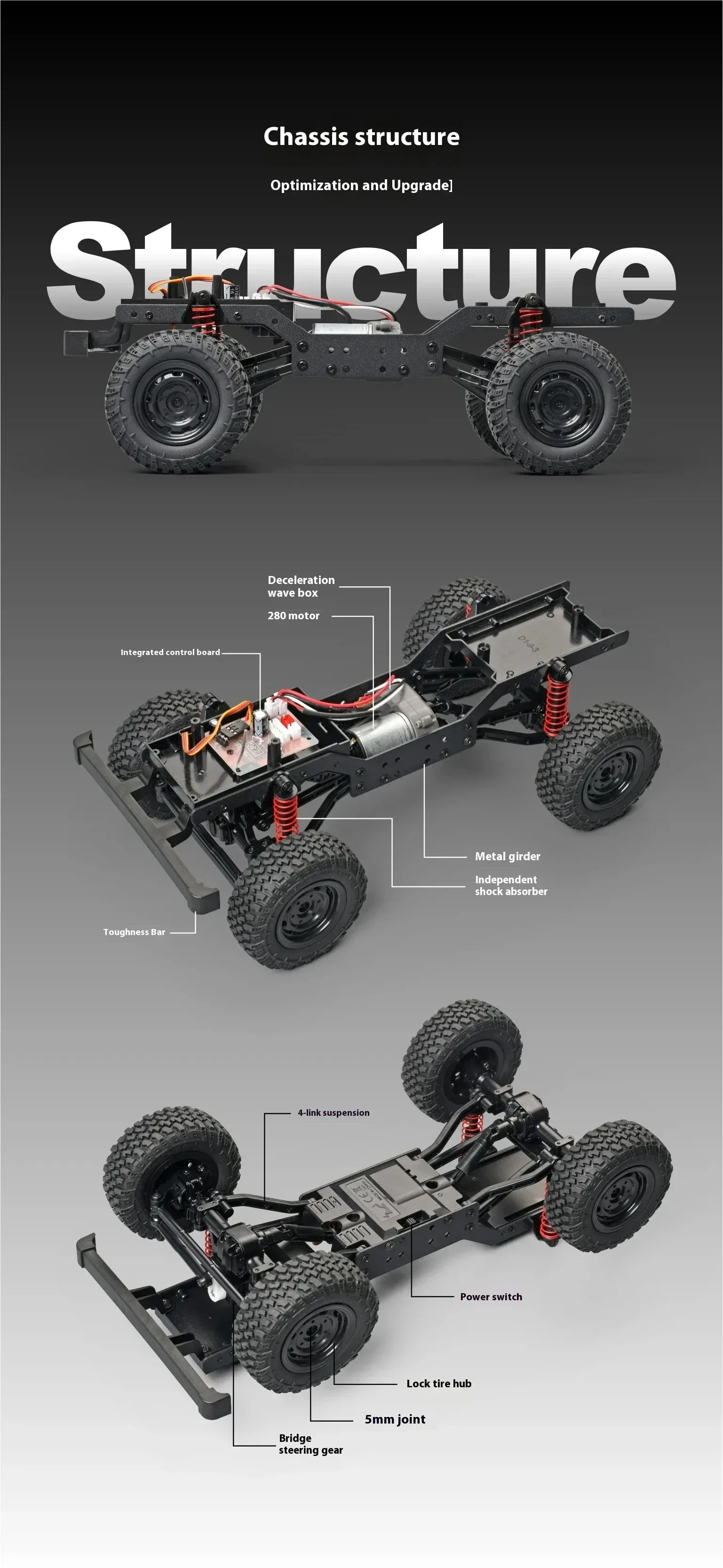 As an upgraded version, MN99S not only has all the functions of MN98, but also adds two-stage speed change and drag brake functions, providing a richer driving experience.