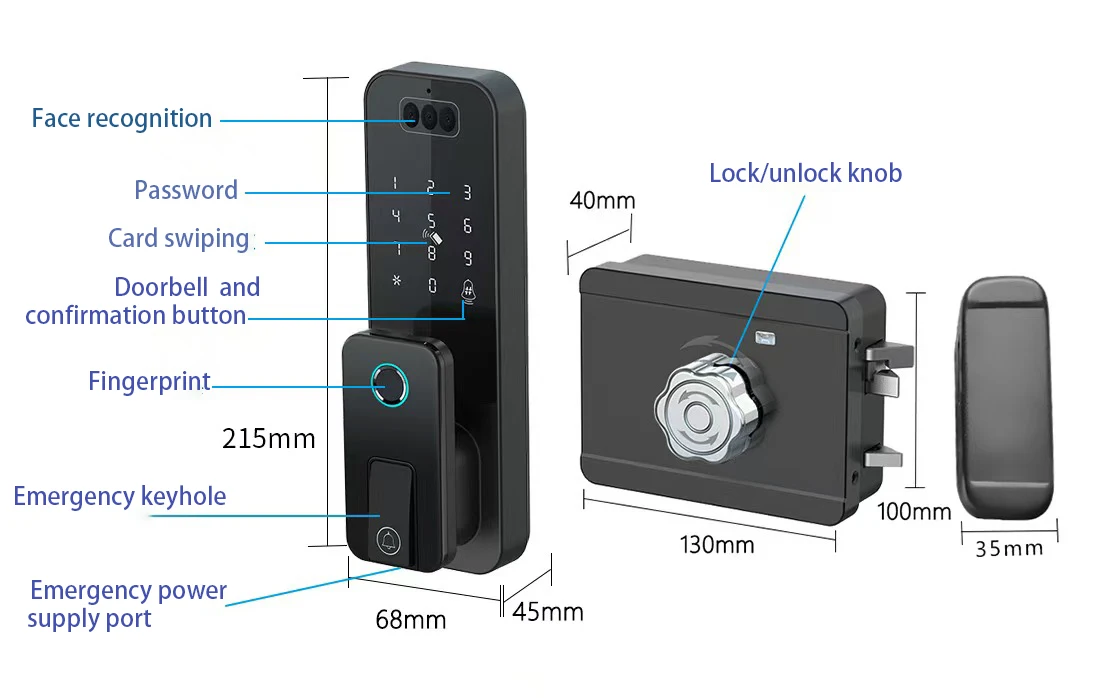 Emergency Charging: Mircro USB portThe smart door lock supports Face recognition/ fingerprint/password/IC card/mechanical key/App multiple unlocking methods.
